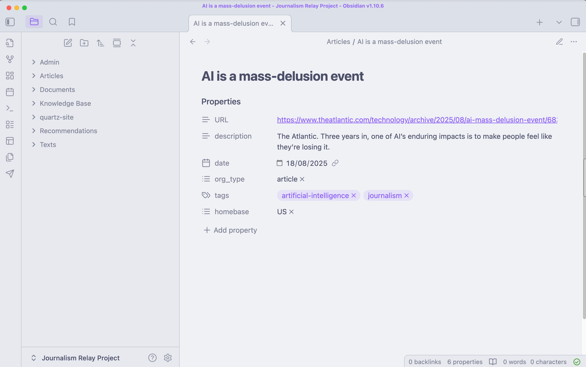 Eu mais ou menos uso o Obsidian há dois anos, mas apenas a partir de meados de 2025 eu realmente entrei pra valer nesse app, e agora ele é meu default para escrever projetos e desenvolver minhas consultorias. Ainda acho iA Writer melhor para sentar e escrever, mas o Obsidian é mais organizado – o bom é que dá pra usar os dois ao mesmo tempo, já que eles usam o mesmo tipo de arquivo localmente no computador.