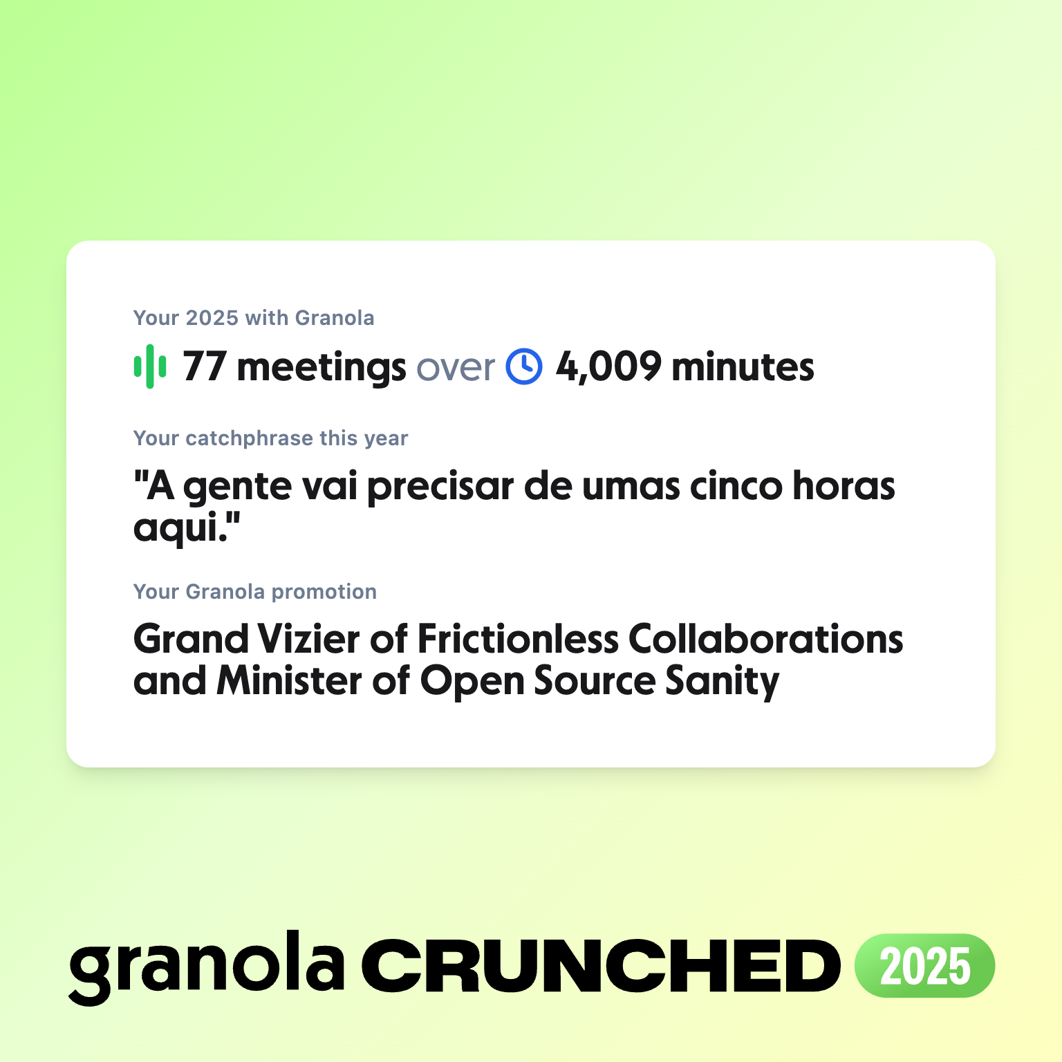 A imagem acima é meu recap do uso do Granola em 2025 (fiquei nos top 25% users).
